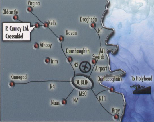 | Situated about 80 kilometers and one hours drive from Dublin, P. Carney Ltd. is strategically located with excellent access to both Dublin Airport and Ferry Port. P. Carney Ltd. can deliver to any U.K. destination within 2 working days and to mainland Europe in 4 working days. |